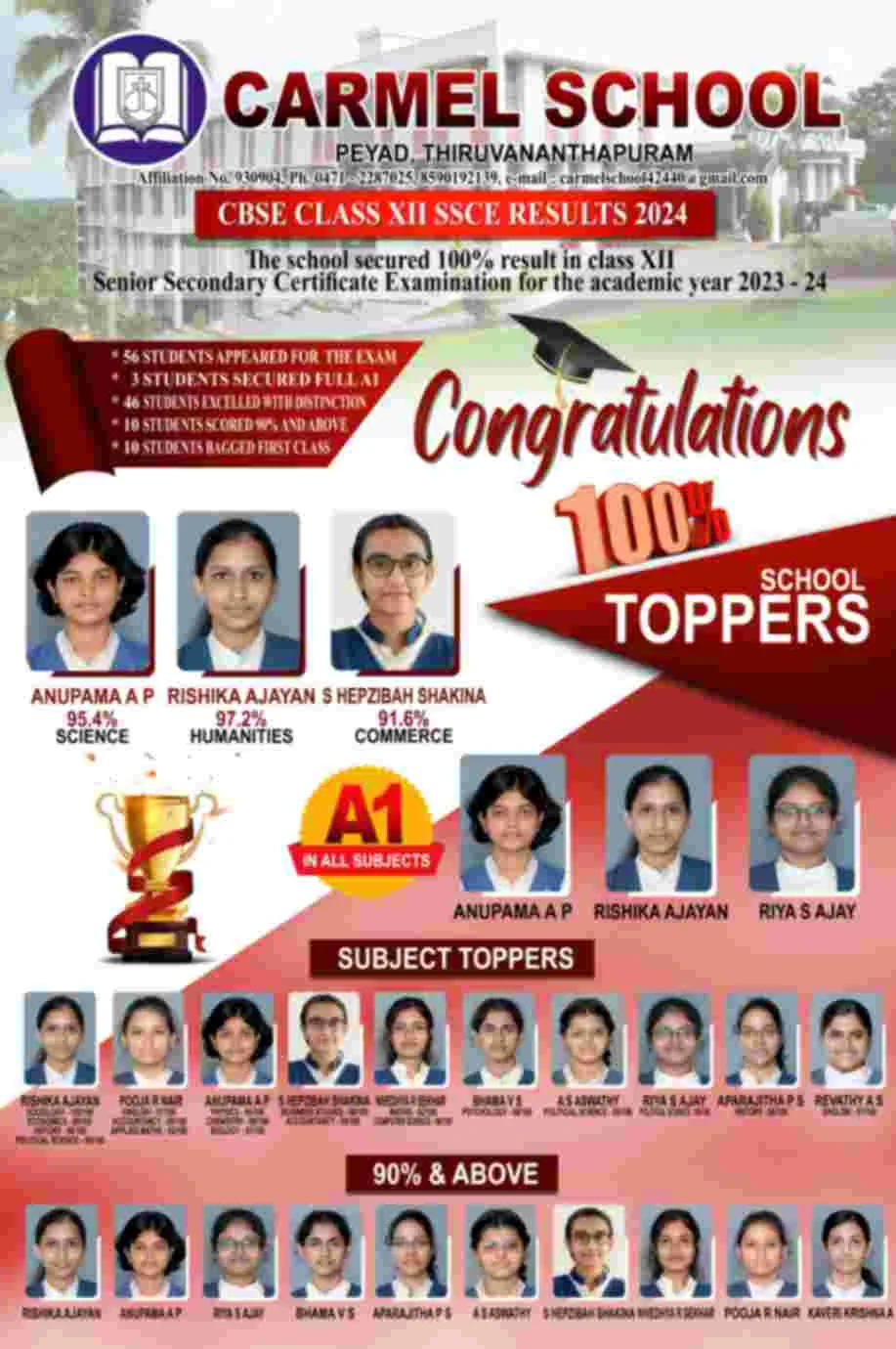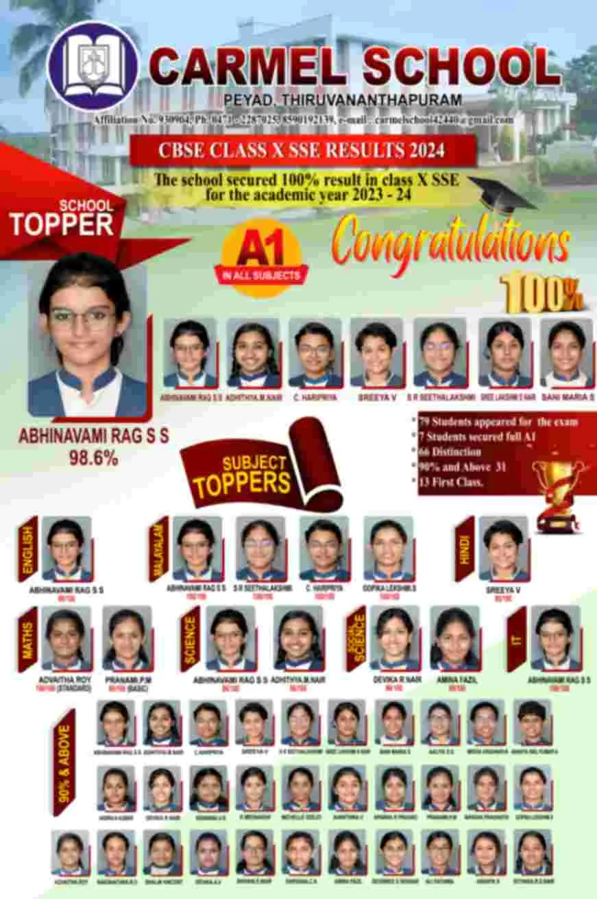 Carmel School Peyad has soared to new heights of success in this year's Class X Board Results of 2024. With 79 students appearing for the exams, Abhinavami Rag S S emerged as the school topper with a remarkable score of 98.6%. Seven students achieved A1 grades in all subjects, while 29 students scored above 90%. Furthermore, 65 students earned a distinction, and 14 students attained first-class honors.